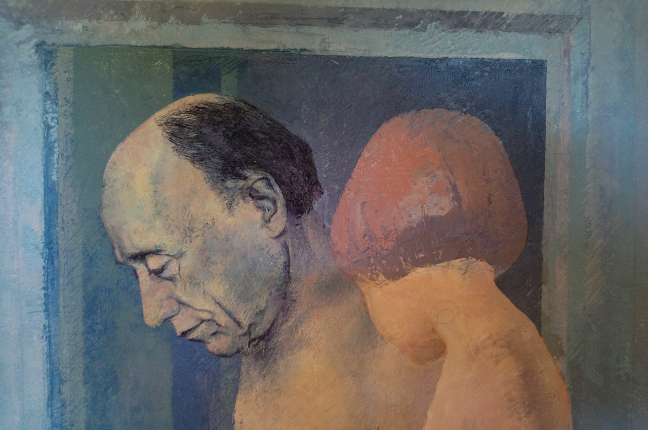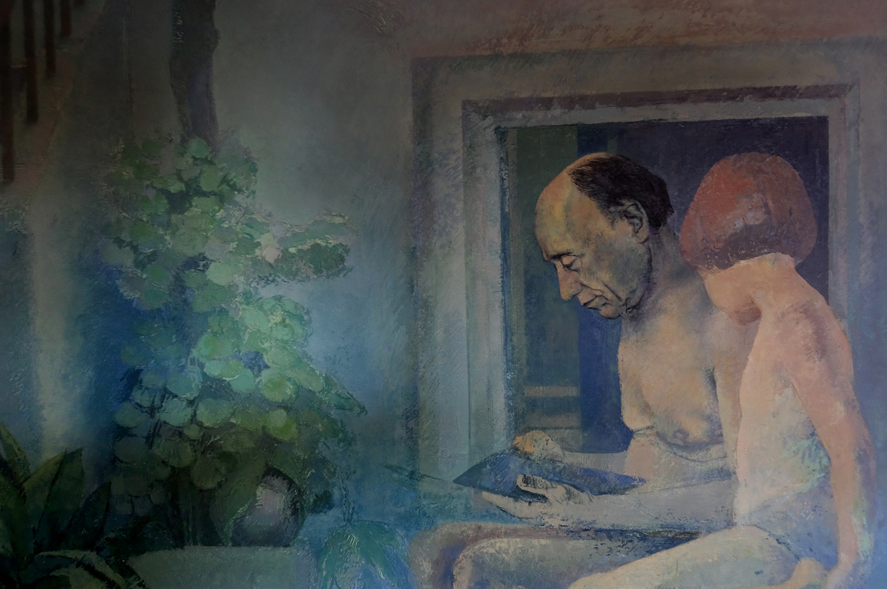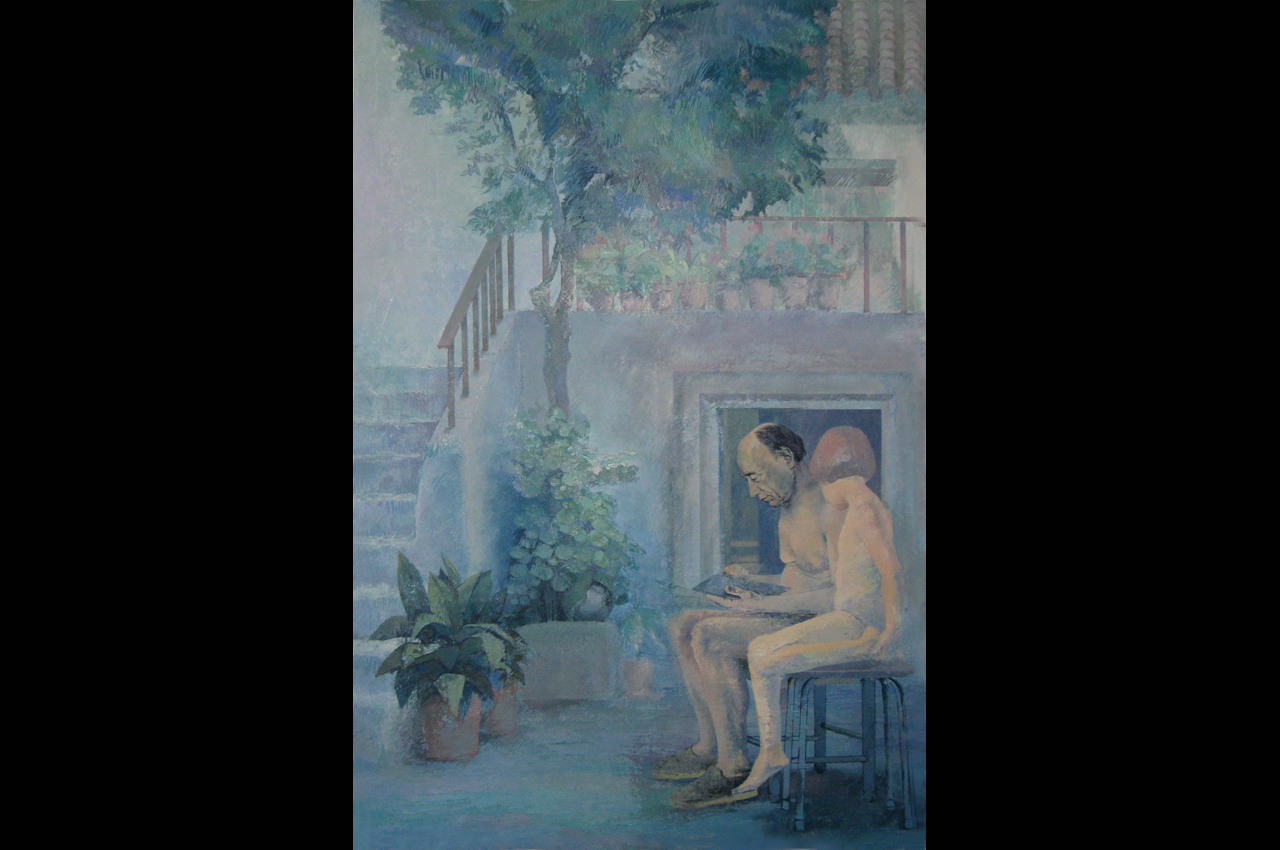 Un abuelo lee a su nieta una tarde de verano. El cuadro está inacabado. Llegó la fecha de presentación a un concurso pero aún no estaba finalizado.